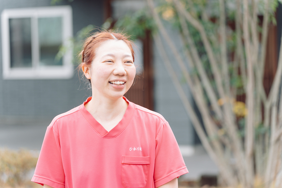 CHAPTER.02実は、以前もグループ内の別の施設で働いていたんです。その時は家庭の事情もあって一度退職したのですが、その後、今の職場のスタッフから「また一緒に働かない?」と声をかけていただいて。「またこのグループで働きたいな」という思いがずっとあったので、そのお誘いをきっかけに、再びこちらでお世話になることに決めました。一度離れたからこそ、改めてこの場所の良さを感じています。